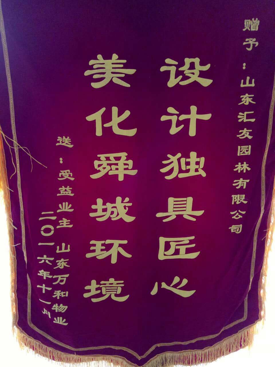 由匯友市政園林集團(tuán)承攬的濟(jì)南市海綿城市建設(shè)興濟(jì)河流域建筑小區(qū)陽光舜城小區(qū)物業(yè)贈送匯友市政園林集團(tuán)錦旗,錦旗上寫著“設(shè)計(jì)獨(dú)具匠心,美化舜城環(huán)境”。