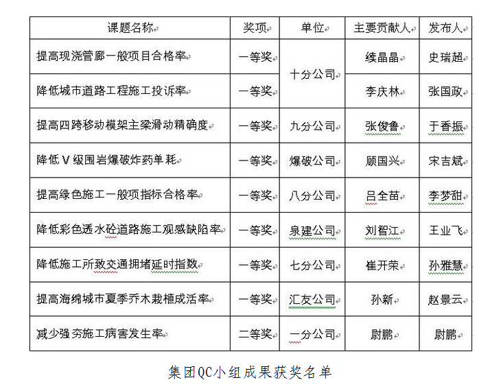 中國市政工程協(xié)會授予集團“全國市政工程建設(shè)QC小組活動優(yōu)秀企業(yè)”,九分公司張俊魯被評為“全國市政工程建設(shè)QC小組活動優(yōu)秀推進者”。